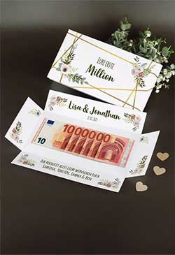 Man fragt sich so oft, was man jemandem Sinnvolles schenken kann. Bevor man jedoch eine falsche oder unsichere Wahl trifft, ist ein Geldgeschenk die perfekte Lösung des Problems. In unserem Sortiment finden Sie viele kreative und ausgefallene Varianten, dies ohne den typischen 08/15-Briefumschlag zu tun. Nicht nur zum Geburtstag oder zur Hochzeit werden Sie bei uns fündig.