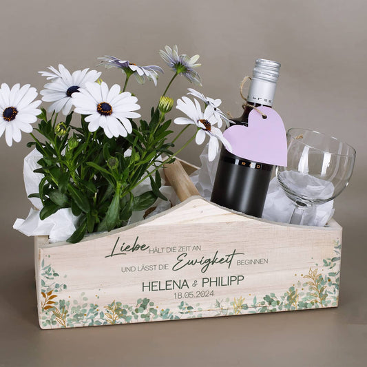 Set zur Hochzeit mit personalisierter Holzbox und zwei Weingläsern