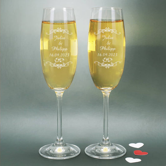 2 gravierte Sektgläser zur Hochzeit mit Name von Braut und Bräutigam sowie Datum