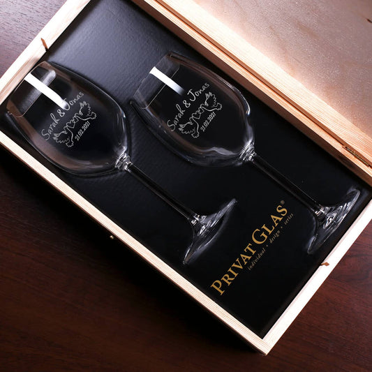Set zur Hochzeit mit personalisierter Holzbox und zwei Weingläsern