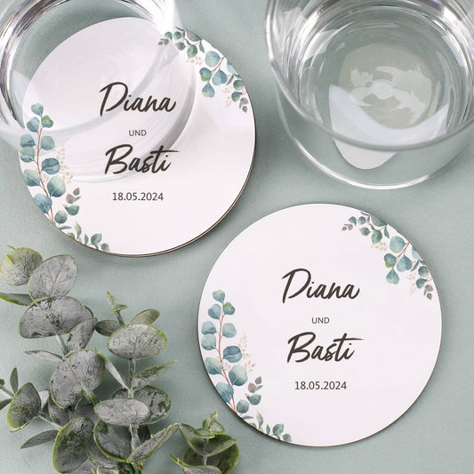 30 Pappuntersetzer zur Hochzeit mit Eukalyptus-Motiv, Namen und Datum
