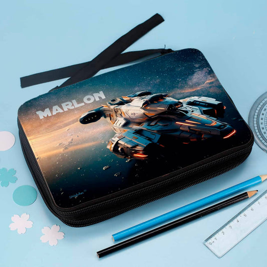 Gefüllte Federmappe mit Raumschiff im Weltall und Name