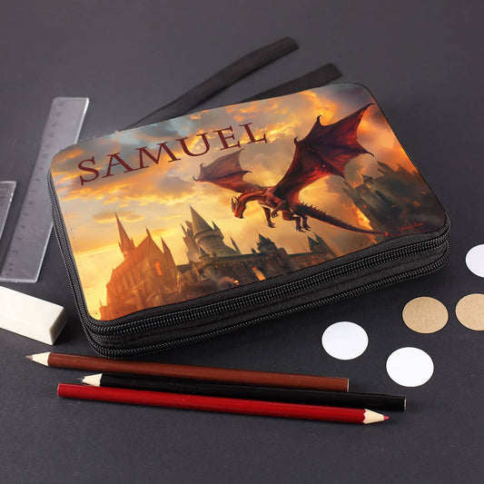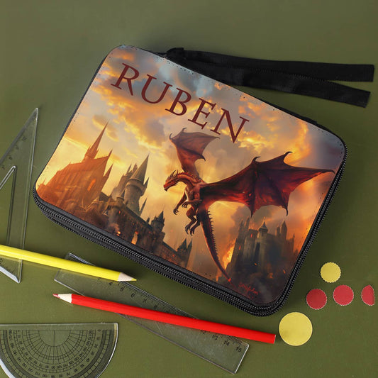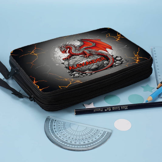 Gefüllte Federmappe mit Drachenmotiv und Wunschname bedruckt