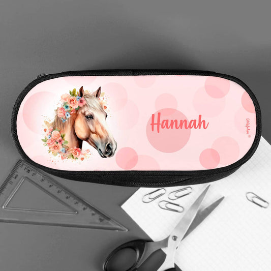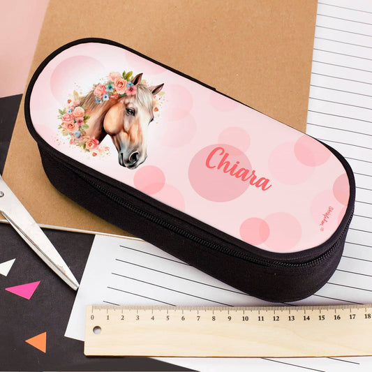 Federmäppchen mit Pferde-Motiv in Aquarelloptik, Blumen und Name