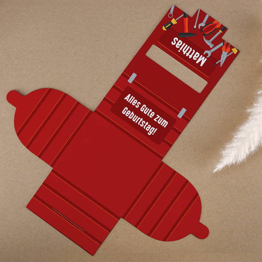 Für Handwerker - Namenstasse in bedruckter Tassentasche im Werkzeugkisten Design