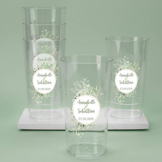 Bedruckter Stapelbecher mit Namen und Datum für Hochzeit, Polterabend, JGA