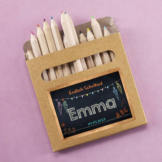 12 kleine Buntstifte mit personalisiertem Etikett zum Schulstart