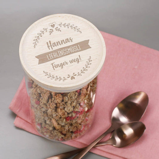 Vorratsdose aus Glas in zwei Größen mit graviertem Holzdeckel