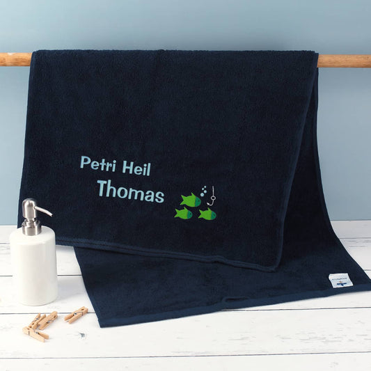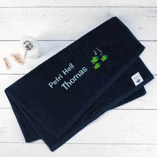 Petri Heil - dunkelblaues Handtuch mit Name bestickt für Angler, 3 Größen zur Auswahl