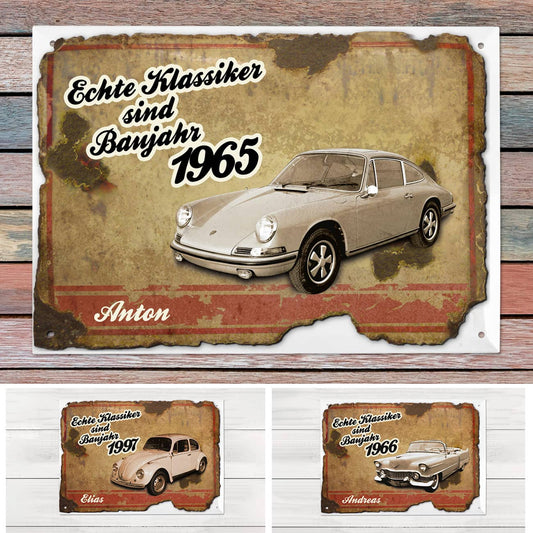 Blechschild mit Autoklassiker personalisiert mit Name und Jahr