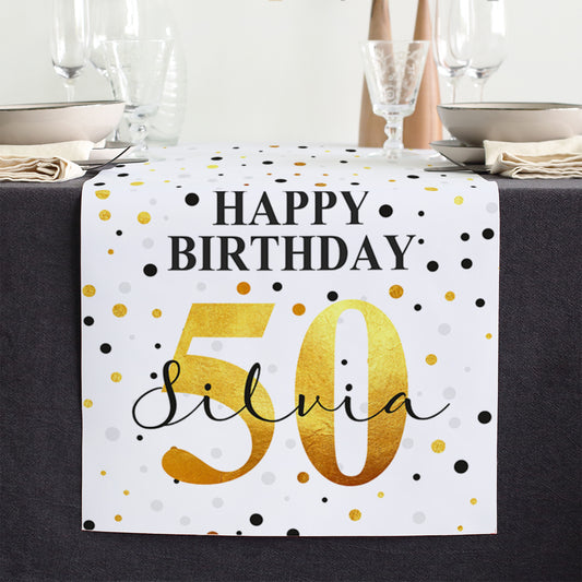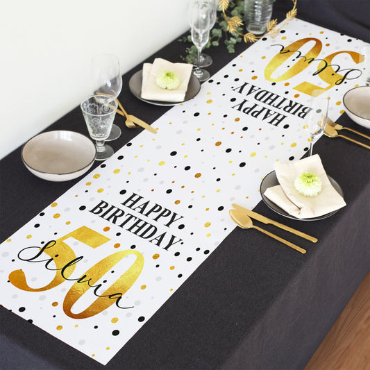 Personalisierter Tischläufer zum Geburtstag mit Name & Alter in Schwarz | Zwei Längen | Konfetti Motiv