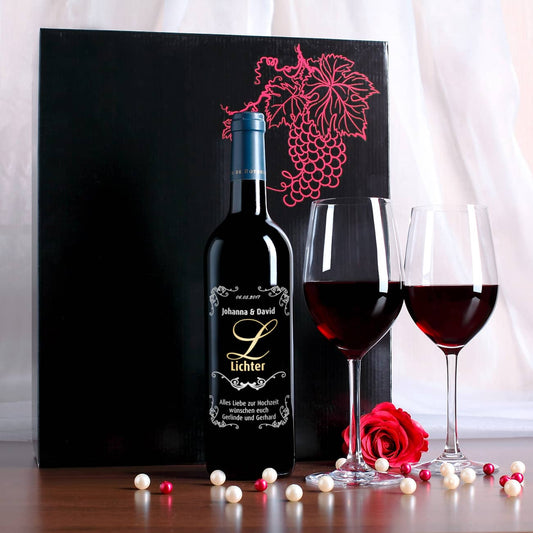Weinglas-Set mit gravierter Rotweinflasche zur Hochzeit in edler Geschenkbox