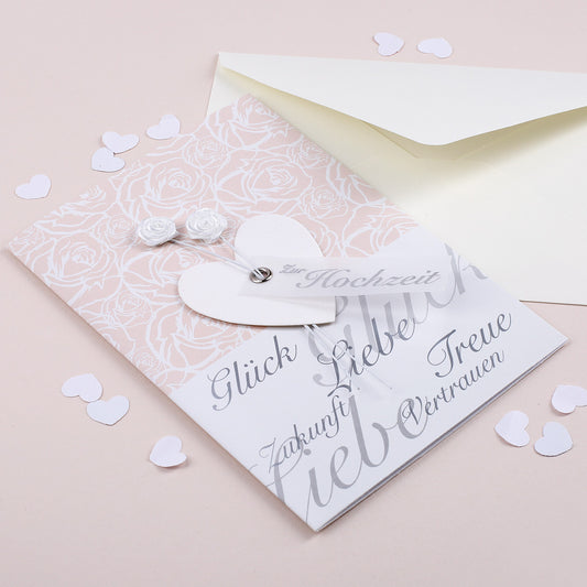 Glückwunschkarte zur Hochzeit mit Rosen- und Herz-Anhänger