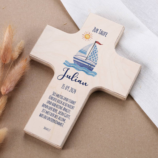 Holzkreuz mit Segelboot und Fischen - zur Taufe, Kommunion oder Konfirmation