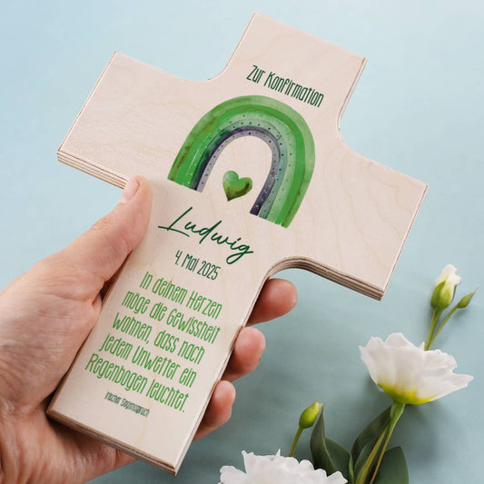 Holzkreuz - mit Regenbogen in 4 Farben wählbar - zur Taufe, Kommunion oder Konfirmation