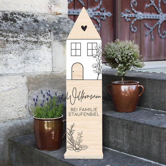Holzhaus-Willkommensschild mit Ihrem Namensaufdruck im modernen Design