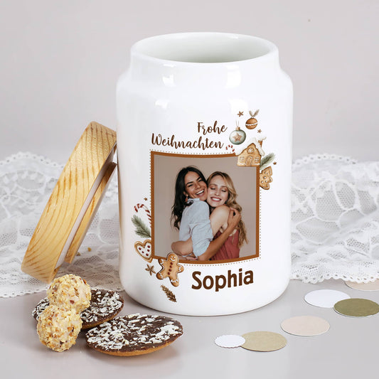 Keksdose mit Lebkuchenmotiv, Ihrem Foto und Wunschnamen bedruckt