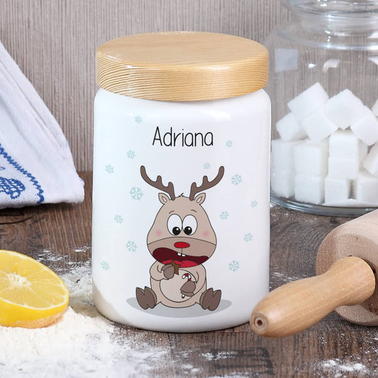 Keksdose mit niedlichem Rentier und Ihrem Namen