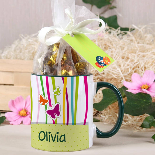 Oster Geschenkset - frühlingsbunte Ostertage - mit Tasse, Schokolade und Geschenkbeutel
