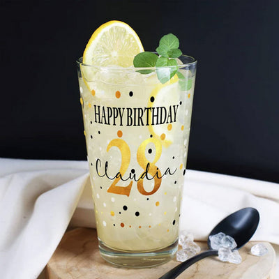 bedrucktes Trinkglas mit Namen in verschiedenen Schriftarten