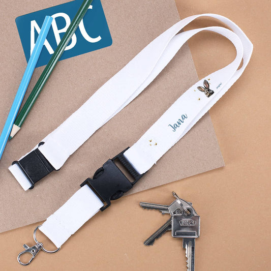 Weißes Schlüsselband mit Ihrem Wunschnamen bedruckt
