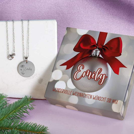 Geburtsblumen-Halskette mit Name graviert in weihnachtlicher Geschenkbox
