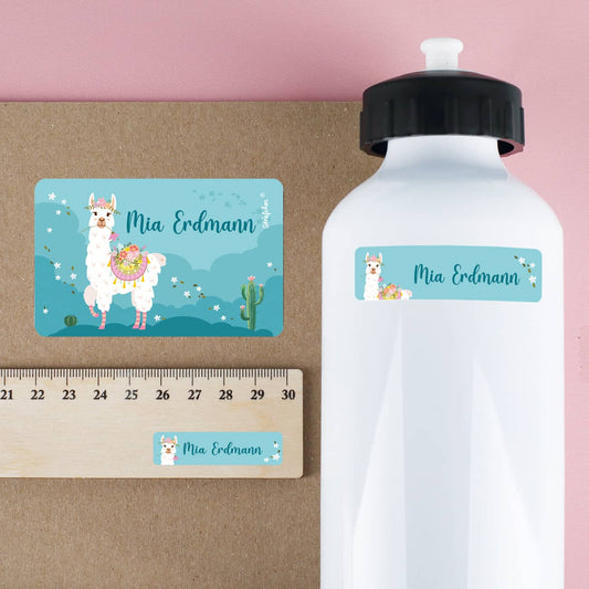 Schulaufkleber mit Lama, Blumen und Name (100 Stück)