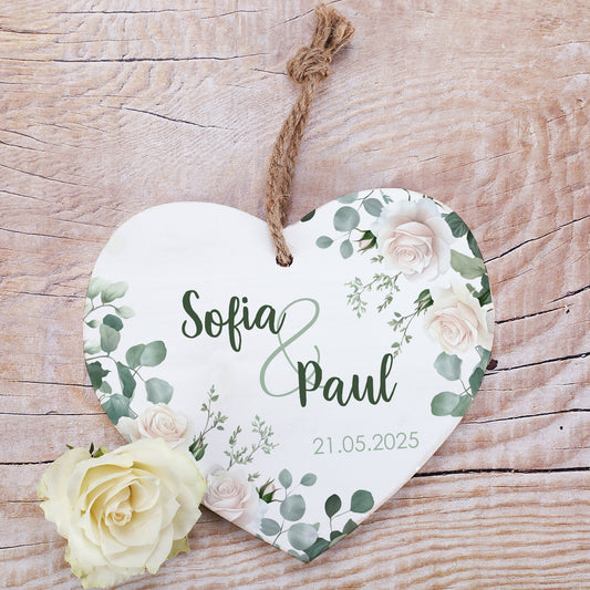 Holzherz mit Wunschnamen und Datum – Romantisches Geschenk mit Blumen-Motiv
