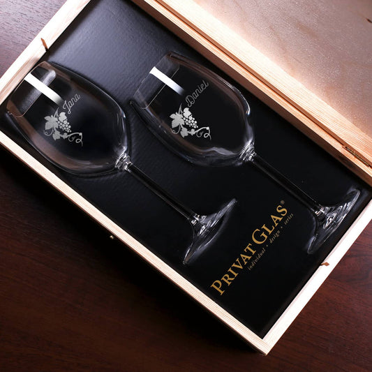 Goldhochzeitswein mit zwei gravierten Gläsern in edler Holzbox