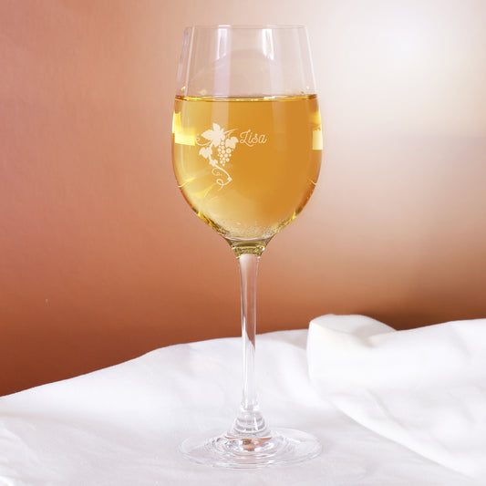 Weißweinglas graviert mit Weintraubenranke und Name von Leonardo