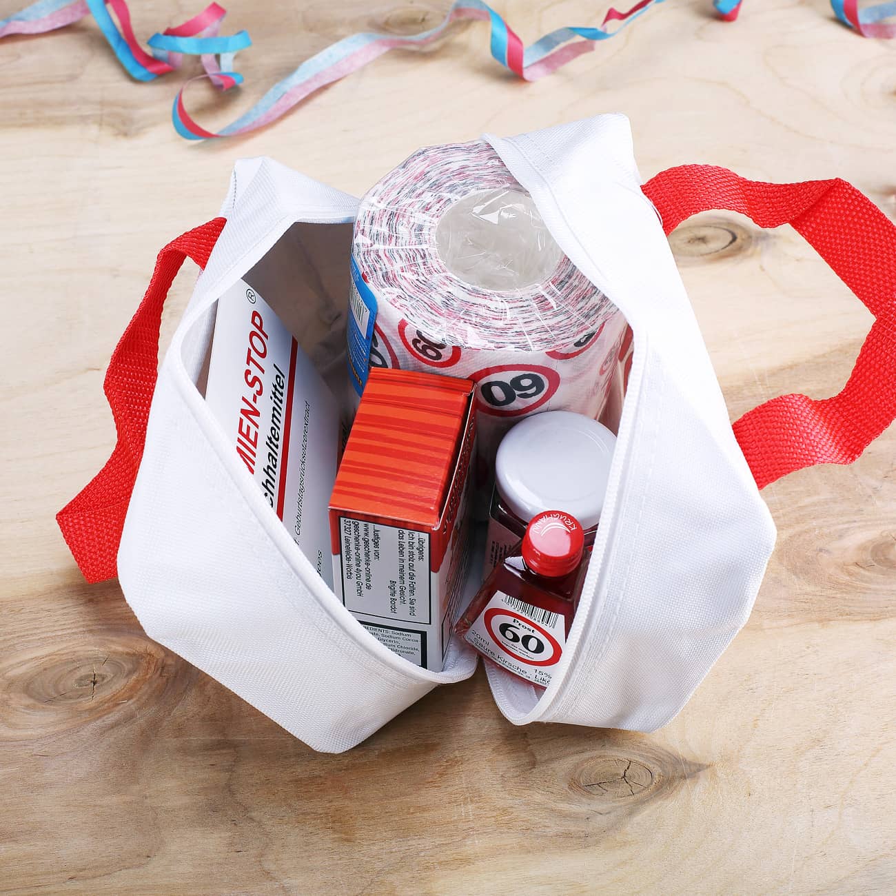 Sie wollen zum 60. Geburtstag erste Hilfe leisten? Hiermit gelingt Ihnen das perfekt. Wir haben ein Set zusammengestellt, dass den Beschenkten mit Sicherheit erfreuen wird. 5 lustige Artikel die den Körper frisch und jung halten. Die 1. Hilfetasche ist zudem noch praktisch, ist der Inhalt aufgebraucht, kann sie bestens als Kulturtasche verwendet werden.