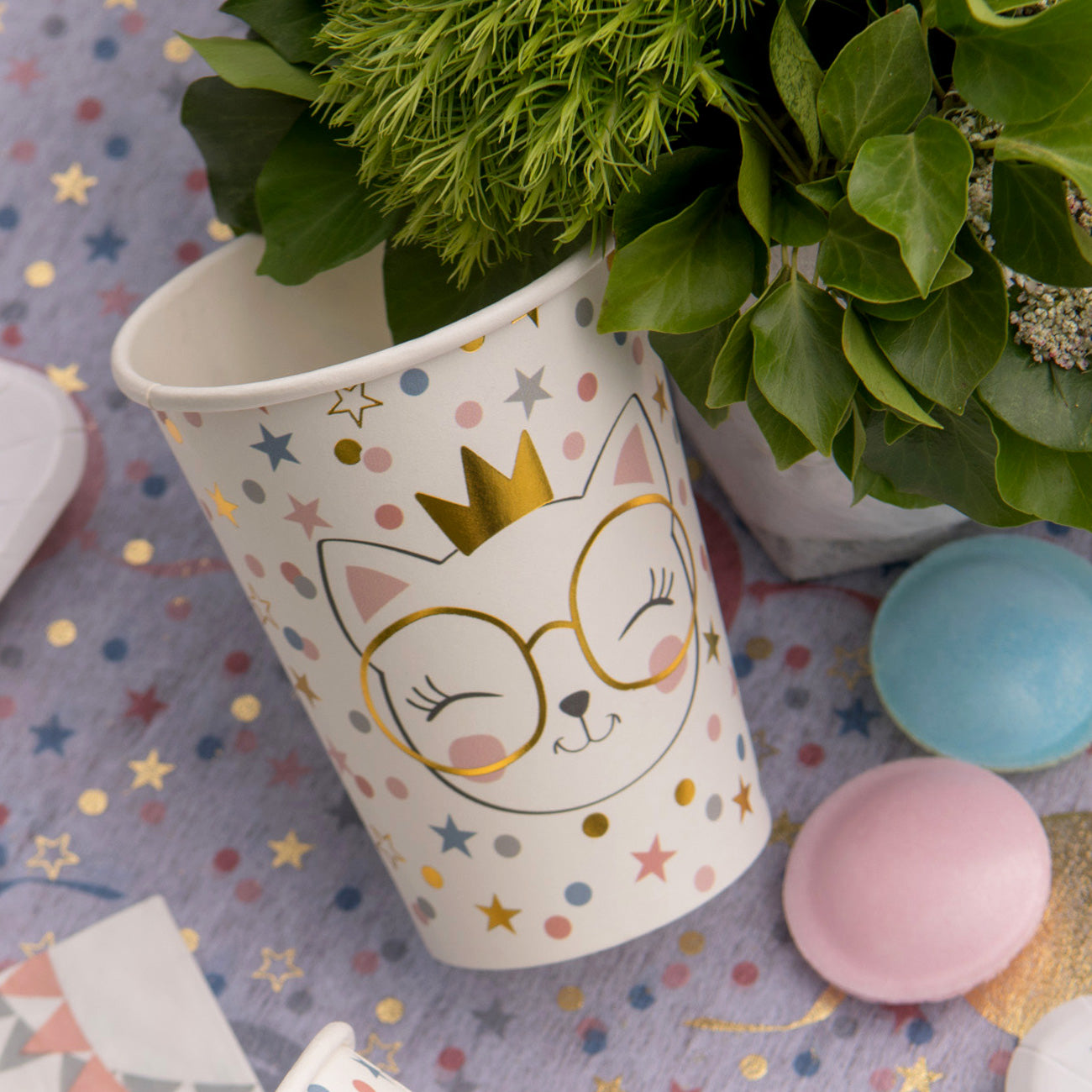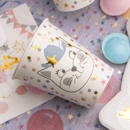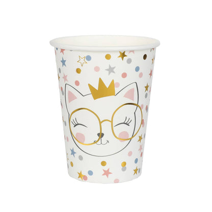 Diese 10 schönen Pappbecher mit einem niedlichen Katzenmotiv passen perfekt zu einem Kindergeburtstag mit kleinen Katzen-Fans. Das Motiv zeigt nicht nur zwei Katzen-Gesichter mit Party Verkleidung, sondern auch kunterbuntes Konfetti mit goldenen Akzenten als Highlight. Egal ob Junge oder Mädchen - die zuckersüßen Pappbecher im Set begeistern alle Gäste und passen perfekt zu einer bunten Dekoration.