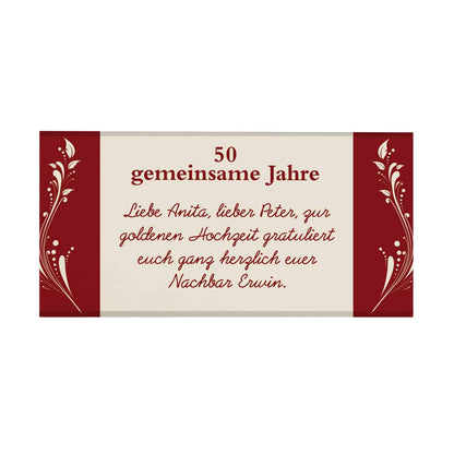 Die Banderole der 100g Schokolade aus Vollmilch ist in Weinrot und Gelb gehalten. Im linken und rechten Bereich der Schokolade sind Blumenranken. Im Motiv sind die Wörter "50 gemeinsame Jahre" schon enthalten. Direkt darunter findet Ihr ganz persönlicher Wunschtext seinen Platz.