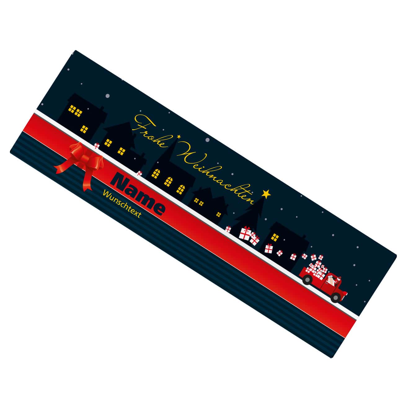 Ho Ho Ho auf dieser 300g Tafel Vollmilchschokolade fährt der Weihnachtsmann seine ganzen Geschenke aus. Das ist aber nicht alles was darauf zu sehen ist, denn das Motiv zeigt neben der Winterlandschaft bei Nacht auch noch den Spruch -Frohe Weihnachten-, den Namen des Empfängers und Ihren ganz persönlichen Text.