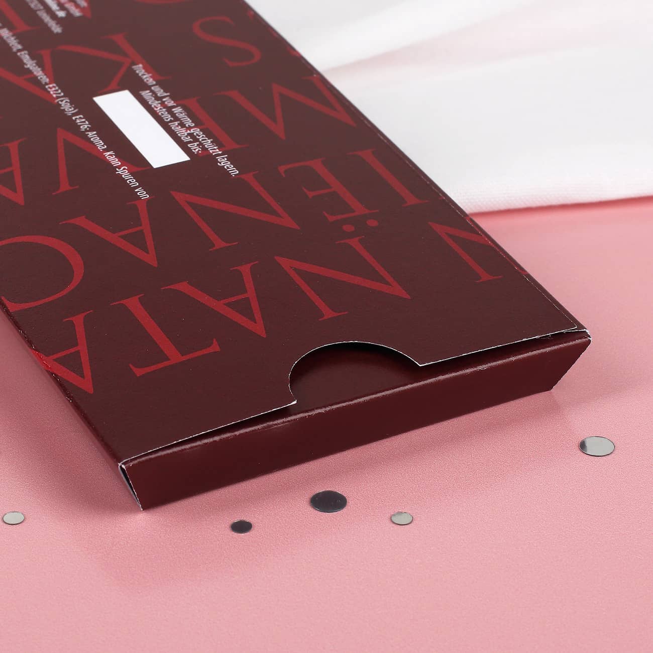 Um diese Milchschokolade als personalisierte Schokolade kommt eine Verpackung mit einem Weihnachtsmotiv mit Ihren Wunschtext. Das Motiv ist ein Weihnachtsbaum mit dem Text "Ein schönes, besinliches Weihnachtsfest." Darunter kommt Ihr persönlicher Text.
