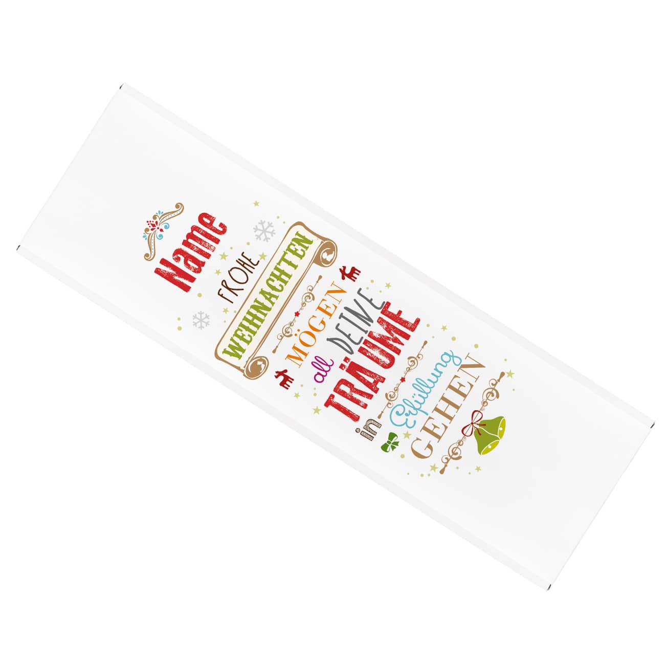 Als Spruch steht auf dieser leckeren 300g Milchschokolade "Frohe Weihnachten " und "Mögen all deine Träume in Erfüllung gehen". Der Name des Beschenkten steht im Motiv im oberen Bereich. Für eine personalisierte Schokolade zu Weihnachten dürfen natürlich typische weihnachtliche Symbole nicht fehlen. Im Motiv sind noch Glocken, Sterne, Eiskristalle und Rentiere abgebildet.