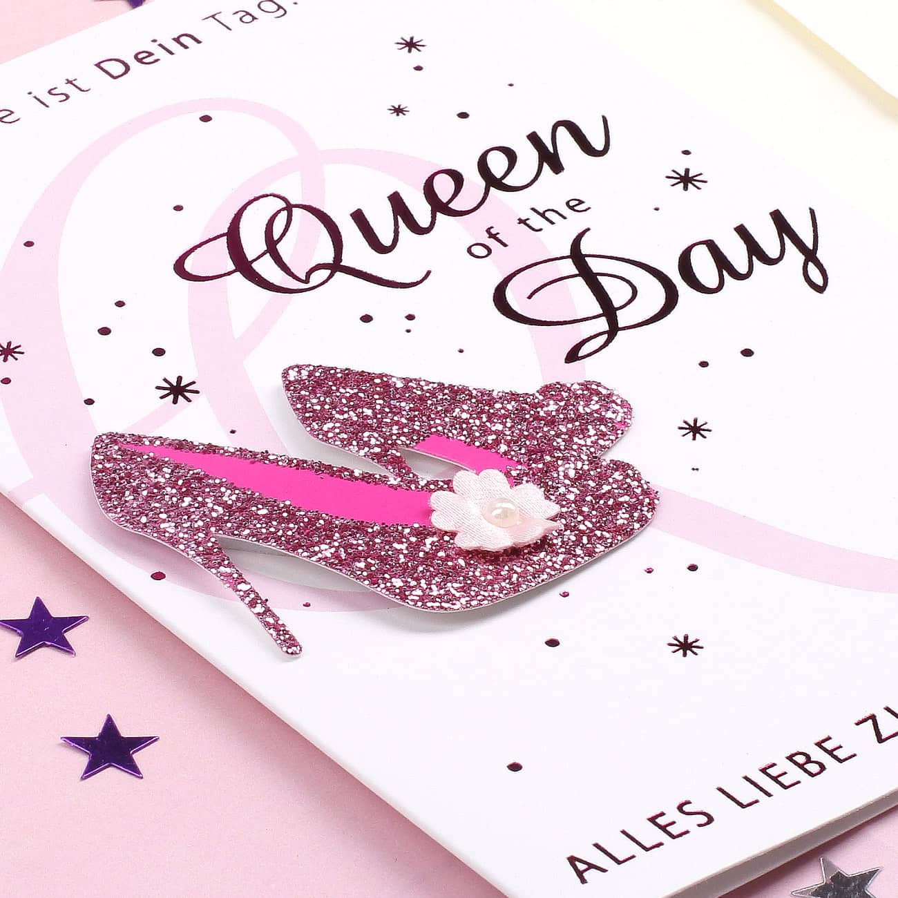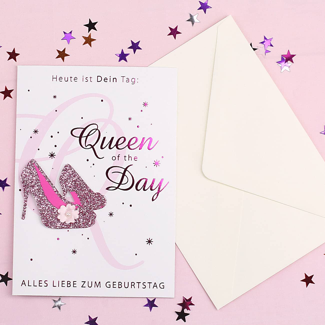 Genau dafür ist auch diese Geburtstagskarte gemacht! „Heute ist Dein Tag: Queen of the Day“ und ein „Alles Gute zum Geburtstag“ bilden die Aufschrift der Karte. Die angebrachten glitzernden und pinken 3D-High Heels zaubern noch mehr Königinnenflair herbei!