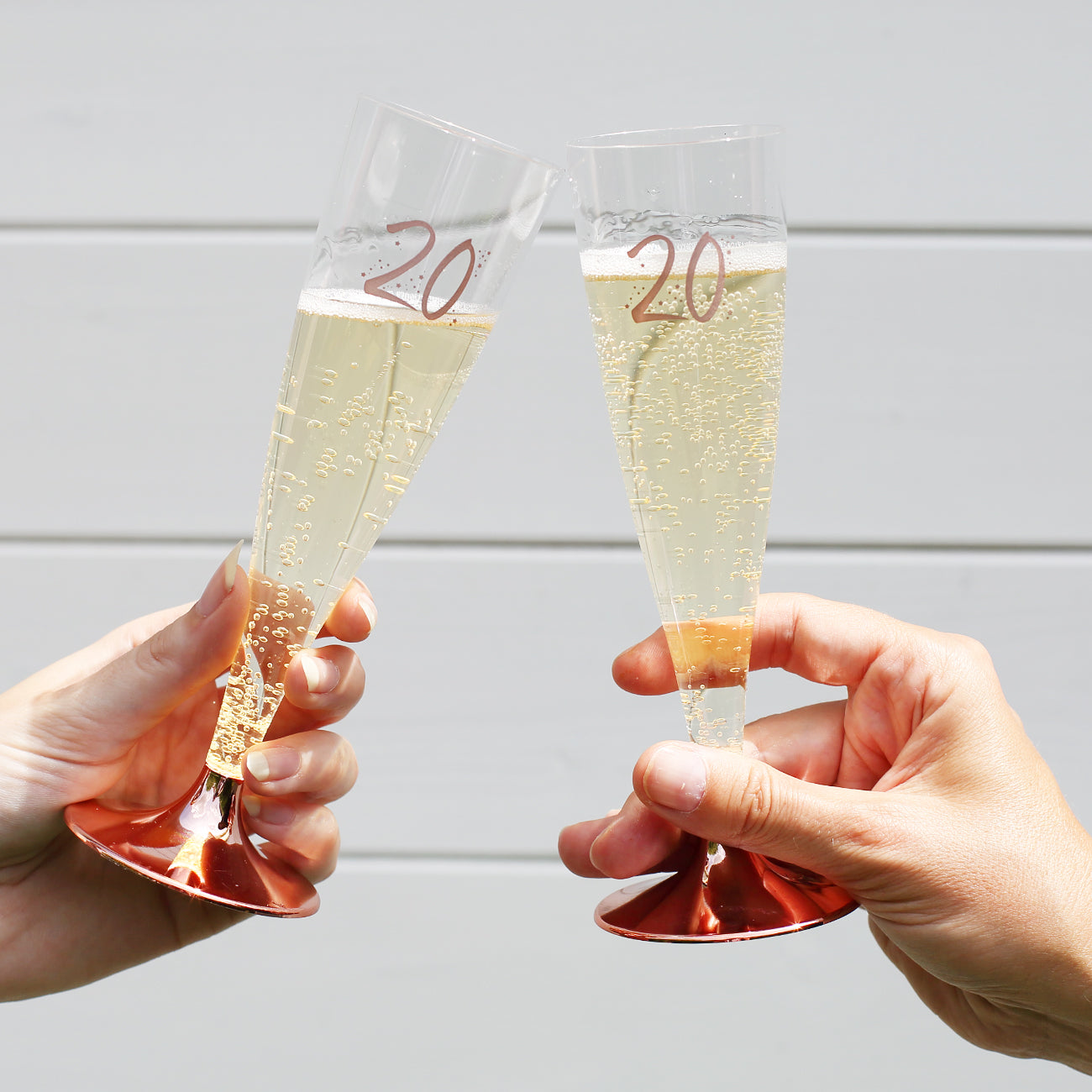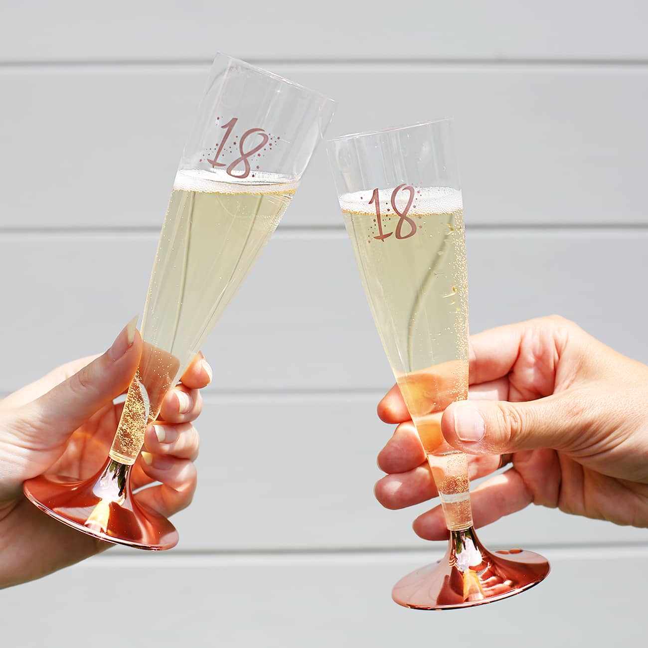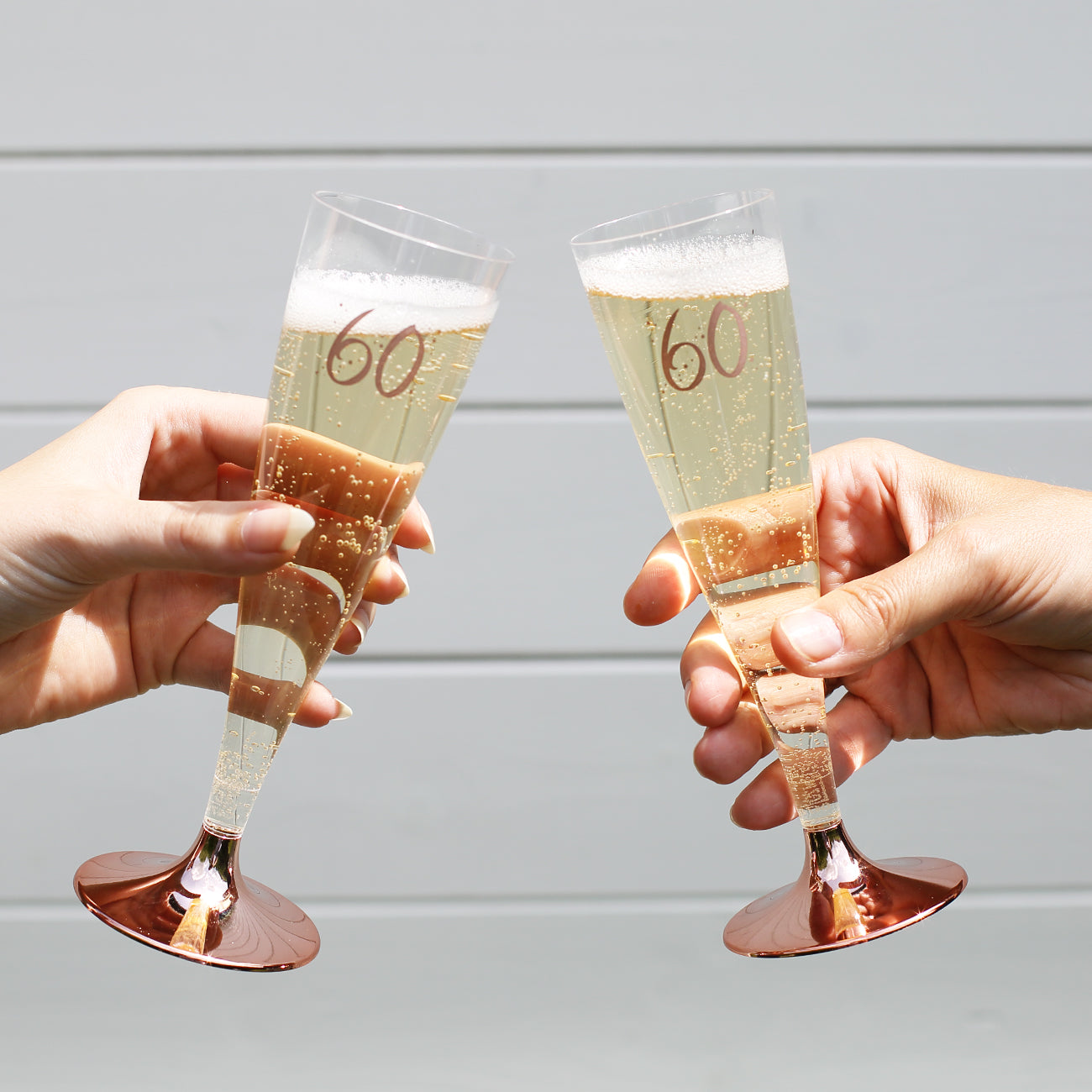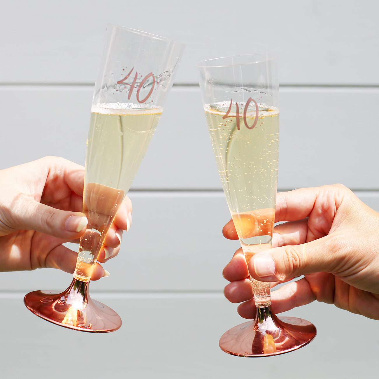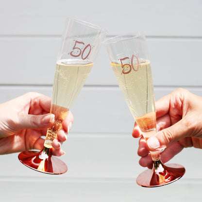 Mit diesen stilvollen Kunststoff-Sektgläsern kann man bestens auf den runden Geburtstag anstoßen! Sie eignen ausgezeichnet für die Garten-Party, für den Sektempfang oder aber auch für eine Geburtstagsüberraschung unterwegs. Die Gläser bestehen aus durchsichtigen Kunststoff und ist bedruckt mit der Zahl des Geburtstages in rosé, umgeben von Sternen. Die Füße der Gläser sind abnehmbar und platzsparend in der Picknicktasche vertaut.