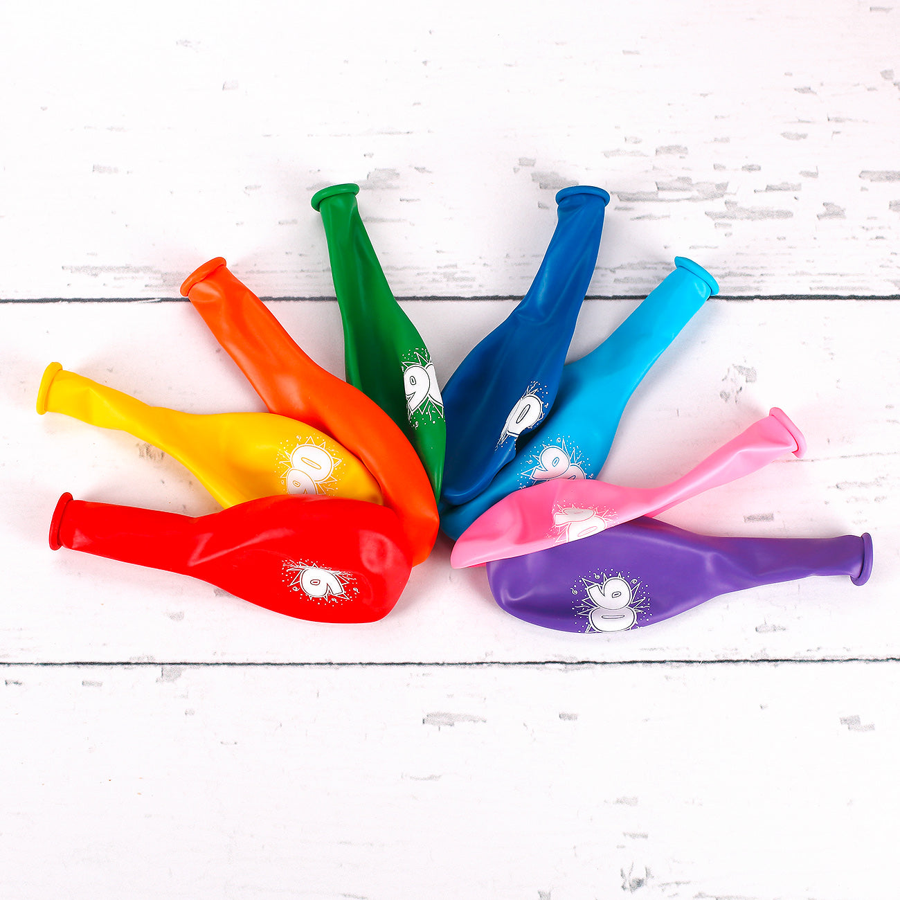 8 farbenfrohe Ballons mit einer weißen 90 können die Deko zu Ihrer Party sein.