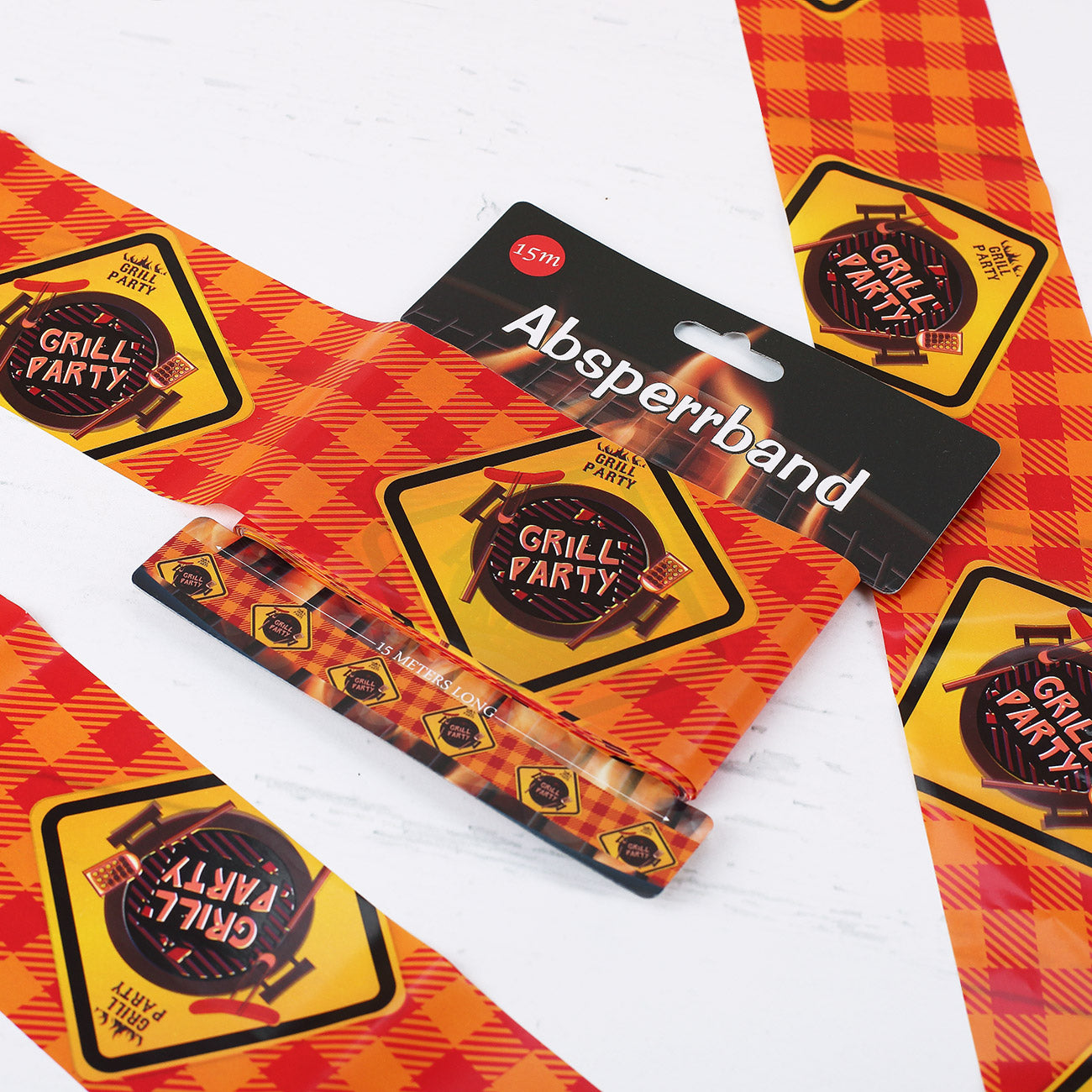 Halt – hier wird gegrillt! Um seinen Grillplatz abzugrenzen und Freunde, Nachbarn und Menschen im Park auf diesen aufmerksam zu machen, eignet sich dieses Absperrband im Grillparty-Motiv. Dieses dient gleichzeitig als kleiner Geck und sorgt sicherlich für viel Aufmerksamkeit! Rot-orange kariert gestaltet, ist der Grill auf dem Motiv bereits am Glühen und wartet schon auf die nächste zu bratende Wurst. Das einseitig bedruckte Band erstreckt sich über 15 Meter und bietet damit ausreichend Länge zur auffälligen Dekoration!