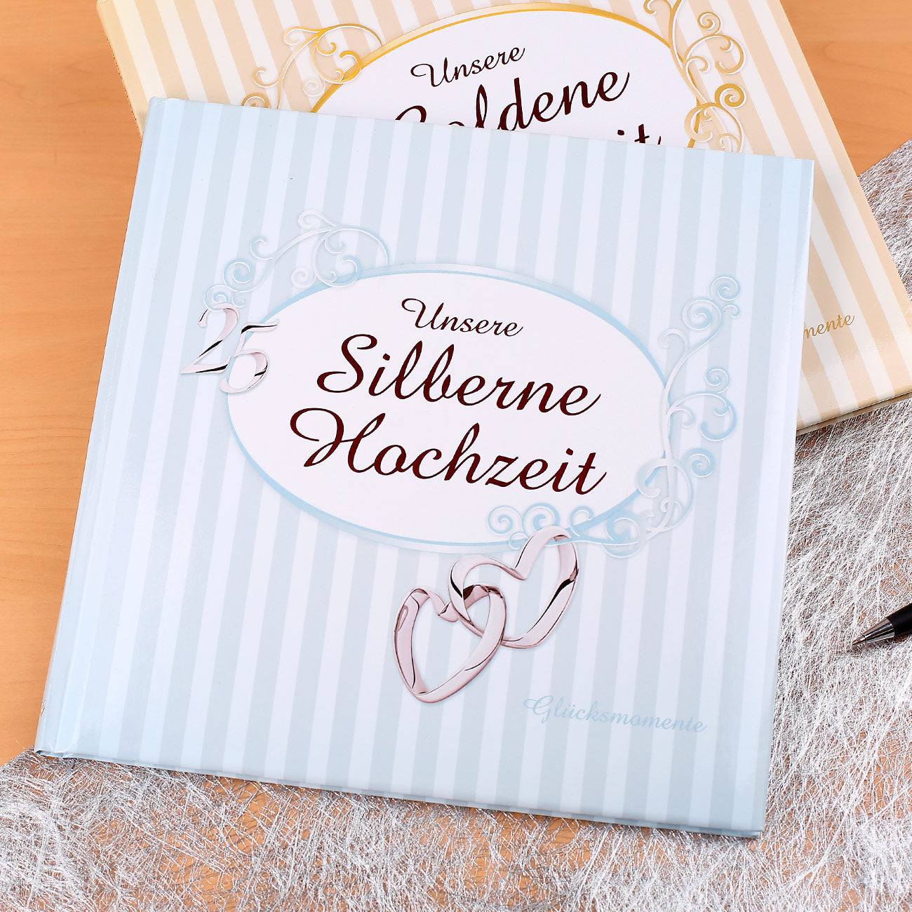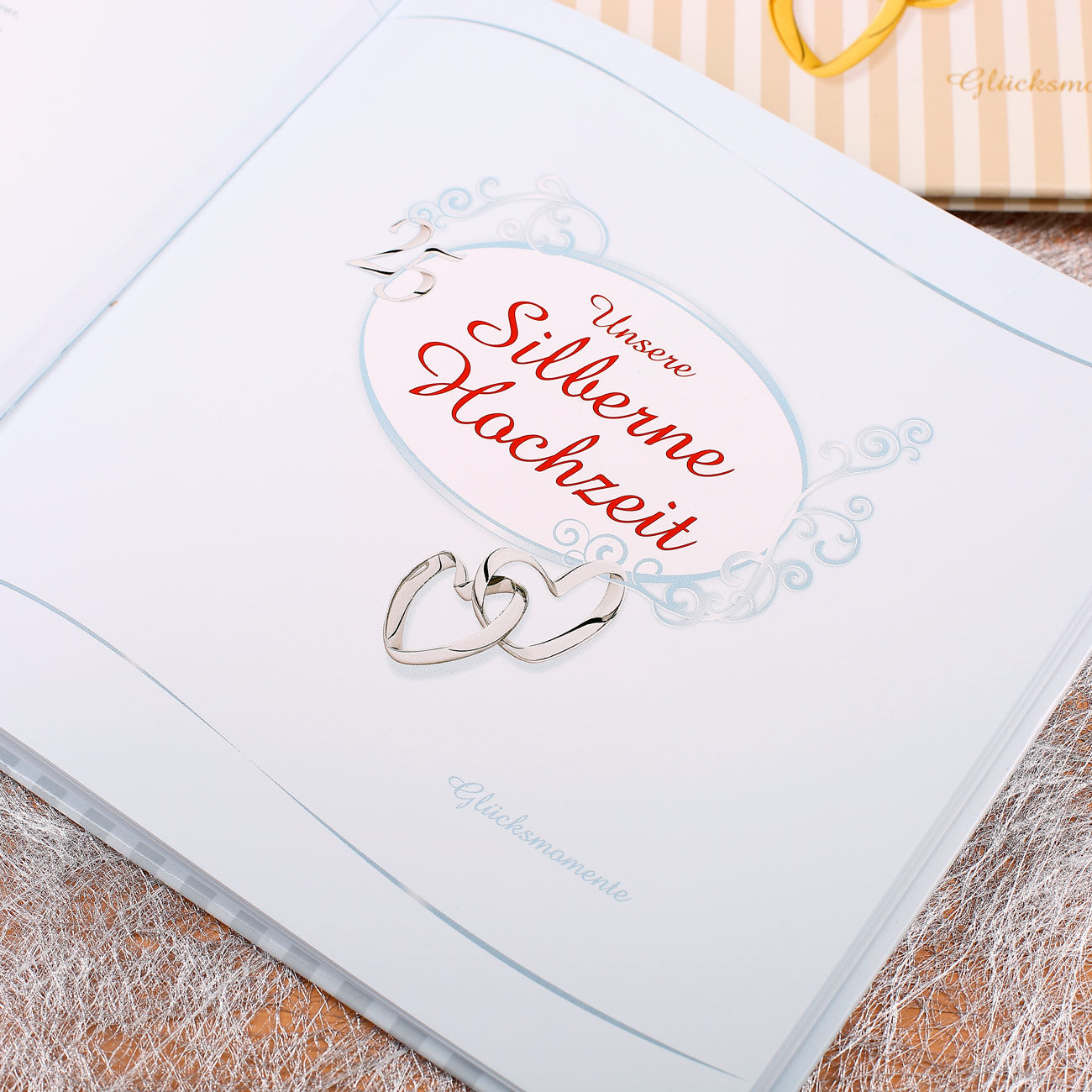 In diesem wunderschönen Album zur Silbernen Hochzeit können Sie alle Bilder und Erinnerungen an den Tag einkleben und eintragen. Das wattierte Hardcover ist mit zwei silberfarbenen Ringen in Herzform und Ornamenten bedruckt. Dazwischen steht der Schriftzug Unsere Silberne Hochzeit. Auf der Rückseite des Albums steht ein tolles Gedicht von Theodor Fontane. Das Album hat 32 farbige Seiten, die Sie nach Ihren Vorstellungen gestalten können.