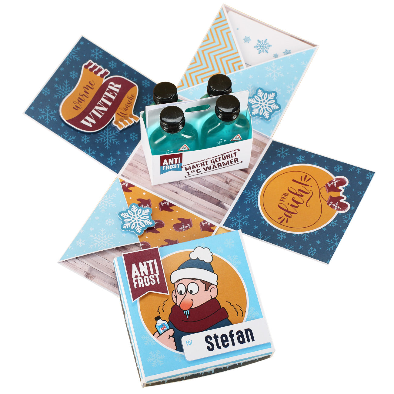 Mit dieser Überraschungsbox kann sich jeder im Winter ganz einfach aufwärmen. Die Explosionsbox funktioniert wie folgt: bei Erhalt erblickt die beschenkte Person zuerst den Deckel mit den Worten "ANTI FROST" für..., das mit einem Namen nach Wunsch personalisiert wird. Wird der Deckel abgenommen, dann fallen die Wände zur Seite und es offenbart sich ein Inhalt mit vier 20 ml Antifrost-Schnäpsen, coolen 3D Elementen und zwei Einstecklaschen, die Karten zum Beschriften beinhalten. Persönliche Glückwünsche finden hier Platz und auch Gutscheine und Geldgeschenke können an diesem Ort eingesteckt werden.