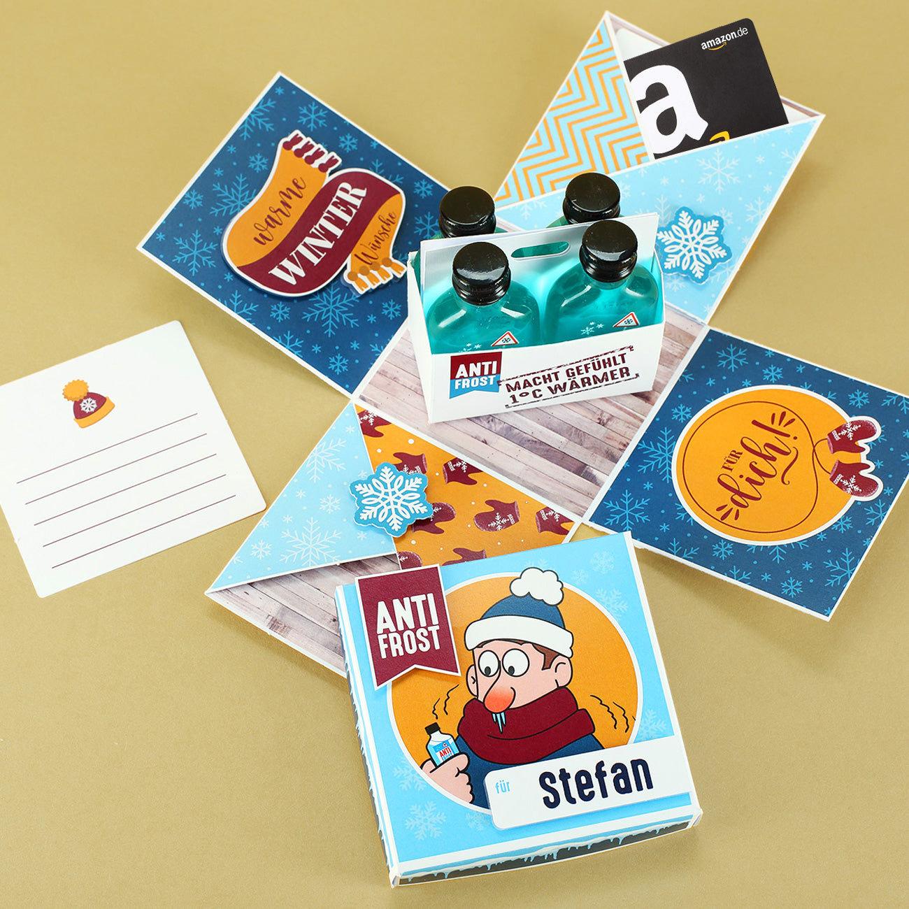 Die Anti Frost Überraschungsbox kann als Verpackung für Geldgeschenke zum Nikolaus oder als Weihnachtsgeschenk dienen. Wenn Sie ein Geburtstagskind kennen, das in den kalten Monaten Geburtstag feiert, dann ist diese Explosionsbox eine ebenso coole Geschenkidee. Mit einem Schnäpschen kann man sich nämlich ganz schnell aufwärmen und die kalte Jahreszeit ist schneller vorbei, als man denkt. Vielleicht haben Sie sogar Glück und die beschenkte Person teilt einen kleinen Anti-Frost-Schutz mit Ihnen.