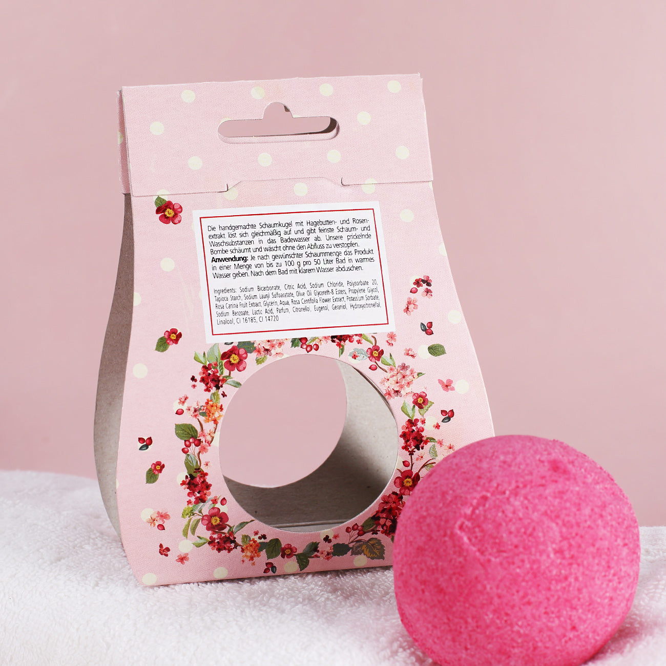 - Bestandteile: Sodium Bicarbonate, Citric Acid, Sodium Chloride, Polysorbate 20, Tapioca Starch, Sodium Lauryl Sulfoacetate, Olive Oil Glycereth-8 Esters, Propylene Glycol, Rosa Canina Fruit Extract, Glycerin, Aqua, Rosa Centifolia Flower Extract, Potassium Sorbate, Sodium Benzoate, Lactic Acid, Parfum, Citronellol, Eugenol, Geraniol, Hydroxycitronellal, Linalool, CI 16185, CI 14720
