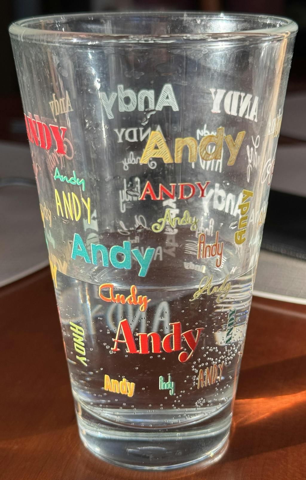 Wie man es auch dreht und wendet - dieses Trinkglas kann Ihnen so schnell niemand wegnehmen. Denn rundherum ist Ihr Name in verschiedenen Farben und Schriftarten gedruckt. Keine Verwechslung mehr im Büro, kein Streit Zuhause, wem welches Glas gehört.