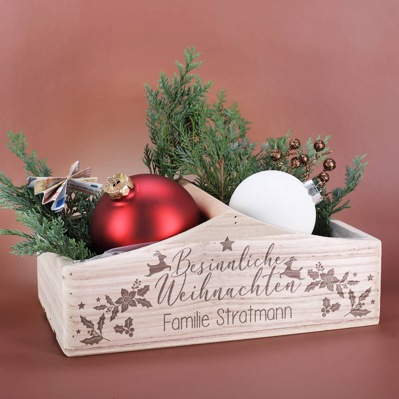 Gravierte Holzkiste als Verpackung für Weihnachtsgeschenke
