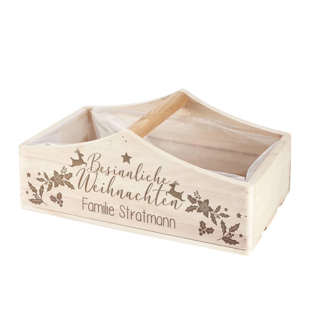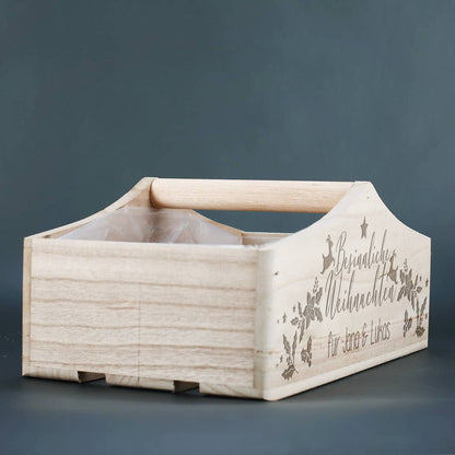 Mit unserem gravierten Pflanzkorb zu Weihnachten verleihen Sie Ihren Festlichkeiten eine persönliche Note. Dieser Holzkorb ist nicht nur eine originelle Geschenkverpackung, sondern auch eine wunderbare Dekoration für die Weihnachtszeit. Unser Pflanzkorb wird auf einer Seite mit einem von Ihnen gewünschten Text graviert, was ihm eine einzigartige Note verleiht. Die festliche Gestaltung mit Rentieren und anderen weihnachtlichen Motiven sorgt für eine stimmungsvolle Atmosphäre. Eine tolle Weihnachtsdekoration oder ein Weihnachtsgeschenk für die Liebsten.