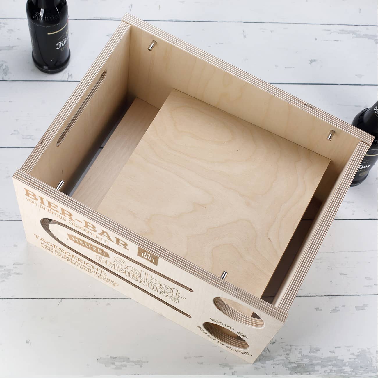 Natürlich sticht besonders hervor, dass die Bierrutsche sehr praktisch ist, aber was das Ganze abrundet ist die persönliche Gravur. Oben links kommt eine Gravur mit den Worten "Bier-Bar von...", die Sie mit dem Namen des Empfängers ergänzen. Daneben kommt noch die Aufschrift "Seit..." die mit dem Jahr der Geburt ergänzt wird. Die Bierrutsche ist wie das Aushängeschild eines Restaurants oder eines Imbiss gestaltet, daher werden auch Sprüche wie "Heute: Selbstbedienung" und "Tagesgericht: Kaltes Schaumsüppchen von Gerste und Hopfen" auf die Vorderseite graviert. Zuletzt wird neben der Öffnung zum Entnehmen der Bierflaschen der Satz "Nimm dir was du brauchst" abgebildet. Dieses witzige Geschenk mit Gravur ist immer eine gute Idee, beispielsweise als Geburtstagsgeschenk, Vatertagsgeschenk oder auch zu einem ganz anderen Anlass.
