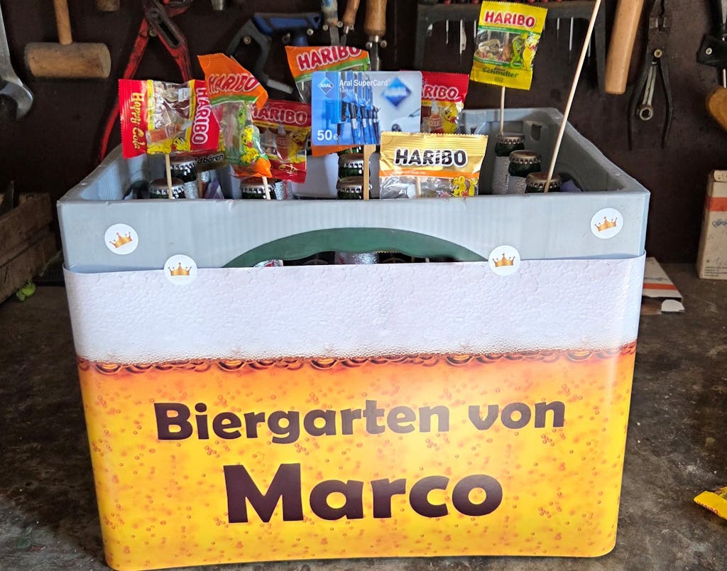 Nicht nur die Banderole ist personalisiert, sondern mit Ihrer eigenen Dekoration können Sie dieses Geschenk mit Druck noch mehr persönlich gestalten und ihm einen gewissen Charme verleihen. Beispiele können Sie aus den Produktbildern entnehmen, die Dekoration und der Bierkasten sind hier allerdings nicht inbegriffen. Stellen Sie sich beispielsweise die Deko mit Artikeln aus unserem Shop zusammen und kombinieren Sie diese mit anderen dekorativen Sachen, wie zum Beispiel Kräutern, Girlanden, Schildern und vieles mehr! Je nach Anlass können Sie den Bierkasten passend dekorieren.