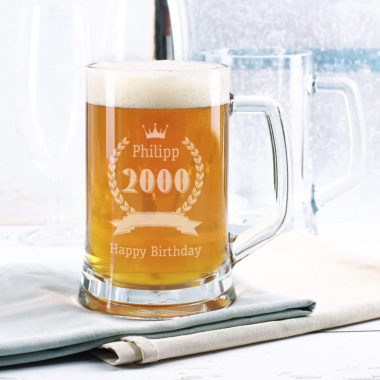 Ein sehr edle Geschenkidee, über die sich garantiert jeder Bierliebhaber freuen wird! Dieses Bierglas wird mit individueller Gravur des Namens und Geburtsjahres für Sie angefertigt. Die Besonderheit bei diesem Bierkrug ist, dass ebenfalls ein persönlicher Wunschtext graviert werden kann. Hier können Sie zum Beispiel besondere Glückwünsche oder die Namen des oder der Schenkenden angeben. Somit ist dieses Bierseidel Geschenk und Grußkarte in einem.